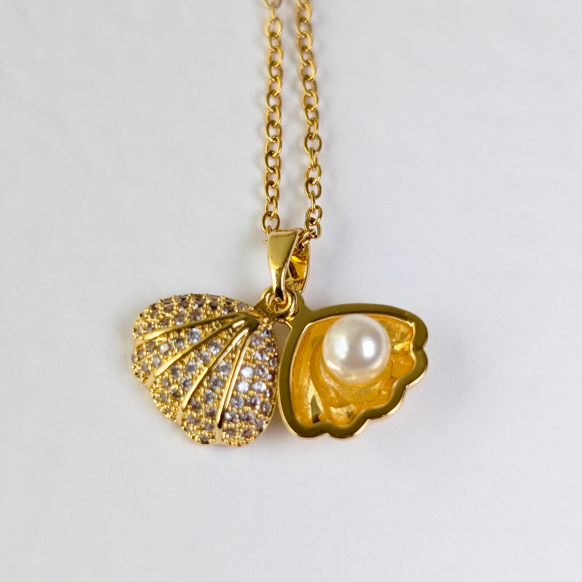 Minimal necklace, stainless steel necklace , golden necklace, anti tarnish necklace, anti tarnish jewellery, sea shell necklace, pearl jewellery.
